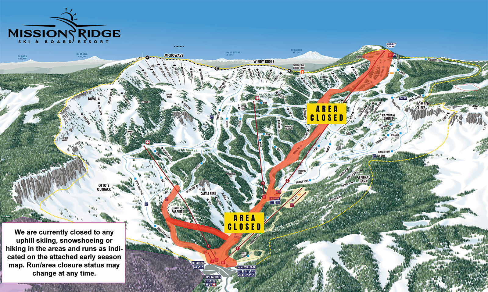 Due to the complexity and variability of mountain setup and snowmaking operations we are closed to any uphill skiing, snowshoeing or hiking in the areas and runs as indicated on the attached early season map. Run/area closure status may change at any time.
